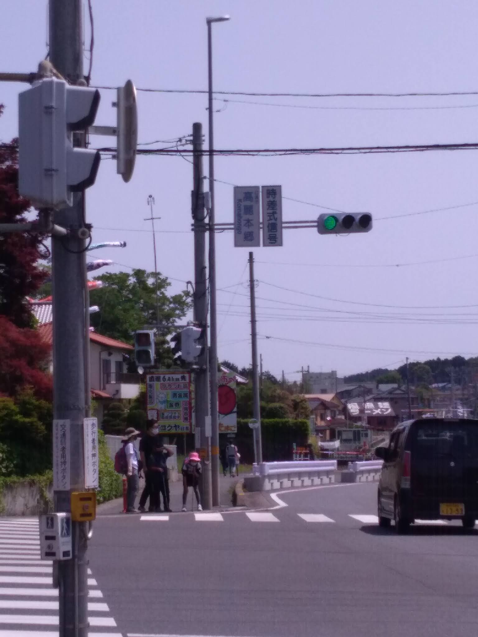 まっすぐ行くと「台(だい)」という交差点になりますが、そこを「直進」します。その次は右折をするので、対向車線側の歩道が良いと思います。狭いので車には充分気を付けてください。