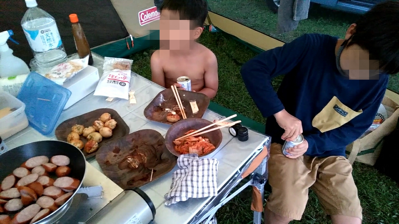 よって現地では、カセットコンロにたこ焼き器を置いて、みんなでジュージューたこ焼きをつつきながら、その他、ウインナーをフライパンで焼いたり、キムチやお菓子食べたり・・ジュースやお酒を飲みながら、まったりと過ごしました。