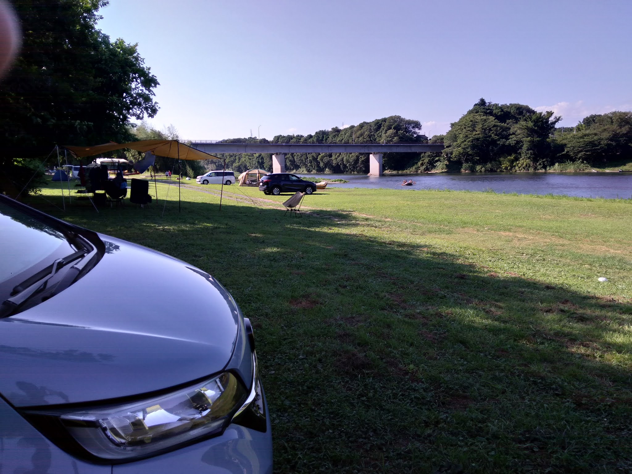 我が家は、木陰のある、川岸からは離れた、画像左側のサイトにテントを立てました。